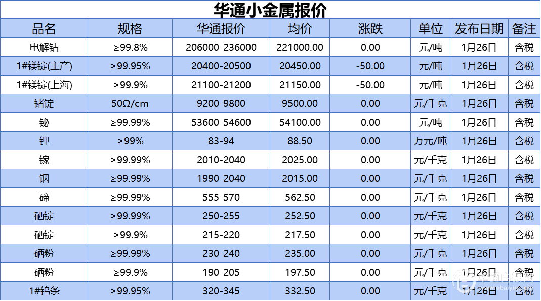 上海华通小金属报价1月26日(钴镁锗铋锂铟硒镓碲钨)